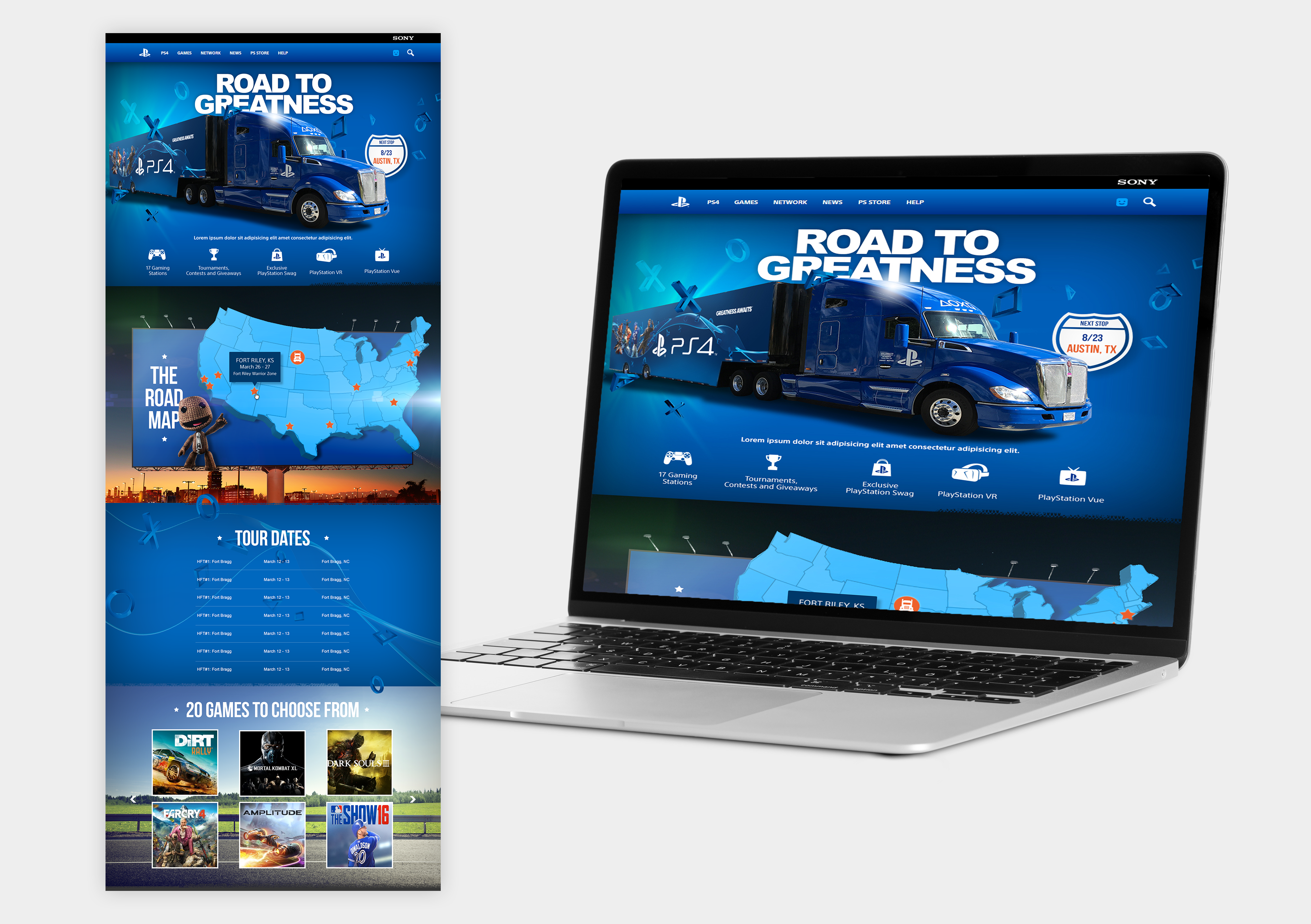A responsive microsite built to capture the energy and momentum of PlayStation’s “Road to Greatness” tour. Designed with fans in mind, the site featured an interactive map, event schedule, and social integration to engage users and drive attendance. Clean UX ensured seamless navigation across devices, while bold visuals aligned with the PlayStation brand.